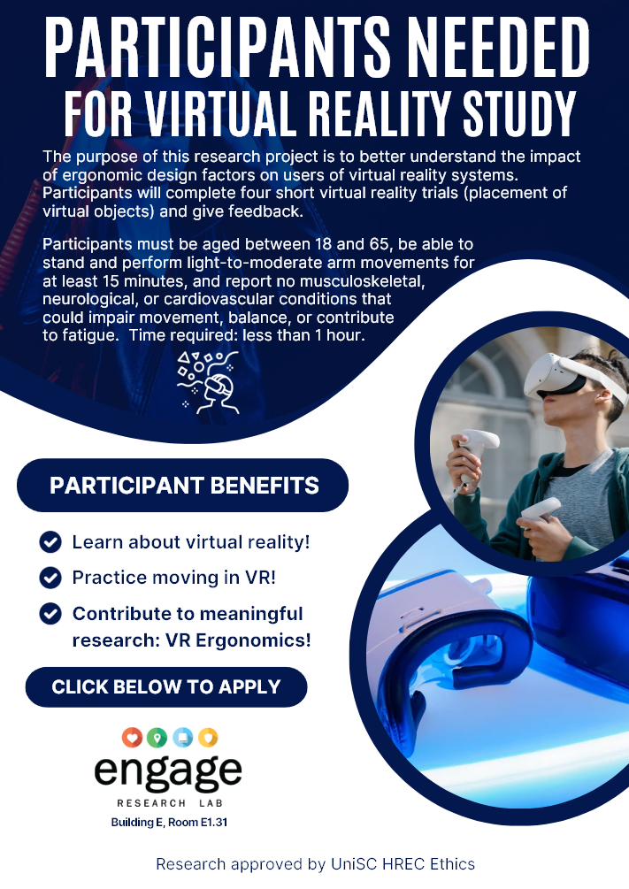 At the University of the Sunshine Coast’s Engage Research Lab, our research team is studying VR ergonomics (Ethics Approval Number: JC03771).
